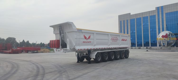 The 6-axis rear-tipping dump trailer features a robust design with five axles for enhanced load-bearing capacity. It enables efficient self-unloading by tipping backwards, making it ideal for transporting and dumping bulk materials.